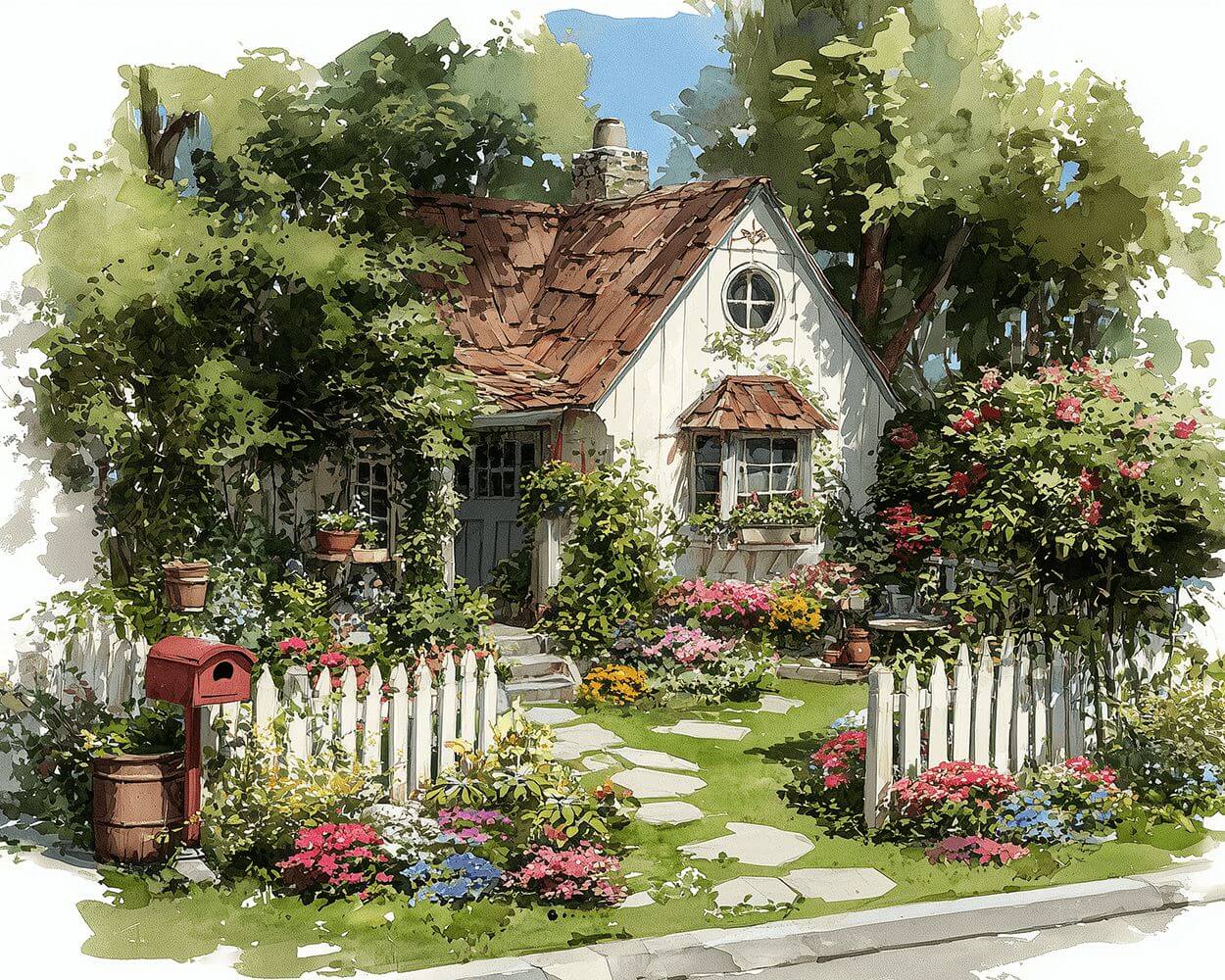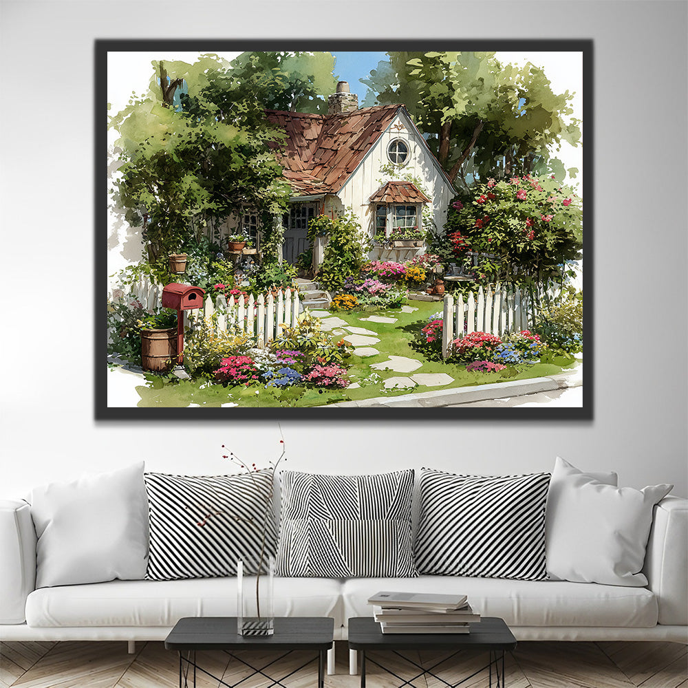 Kleines weißes Haus voller Blumen und Pflanzen Malen nach Zahlen