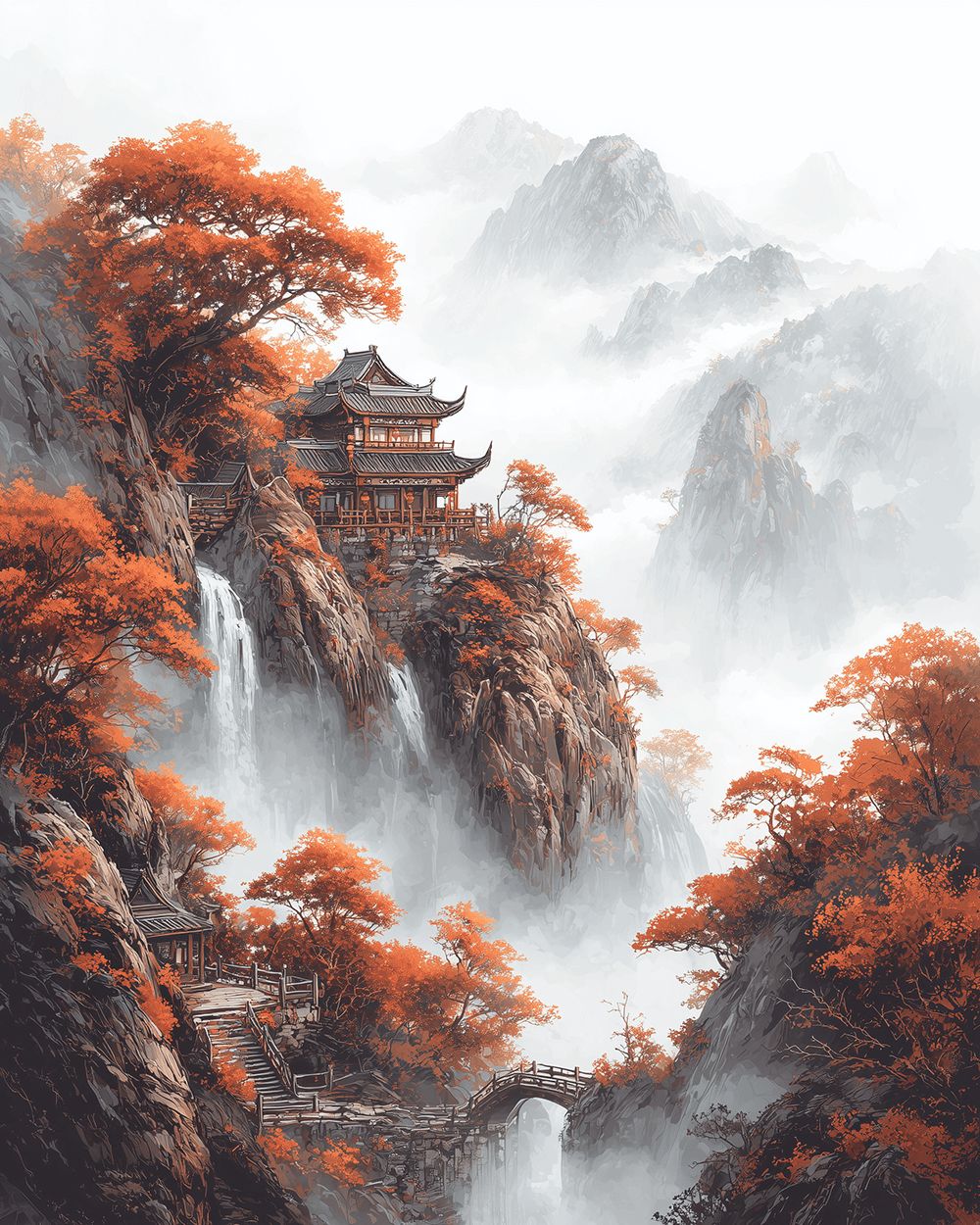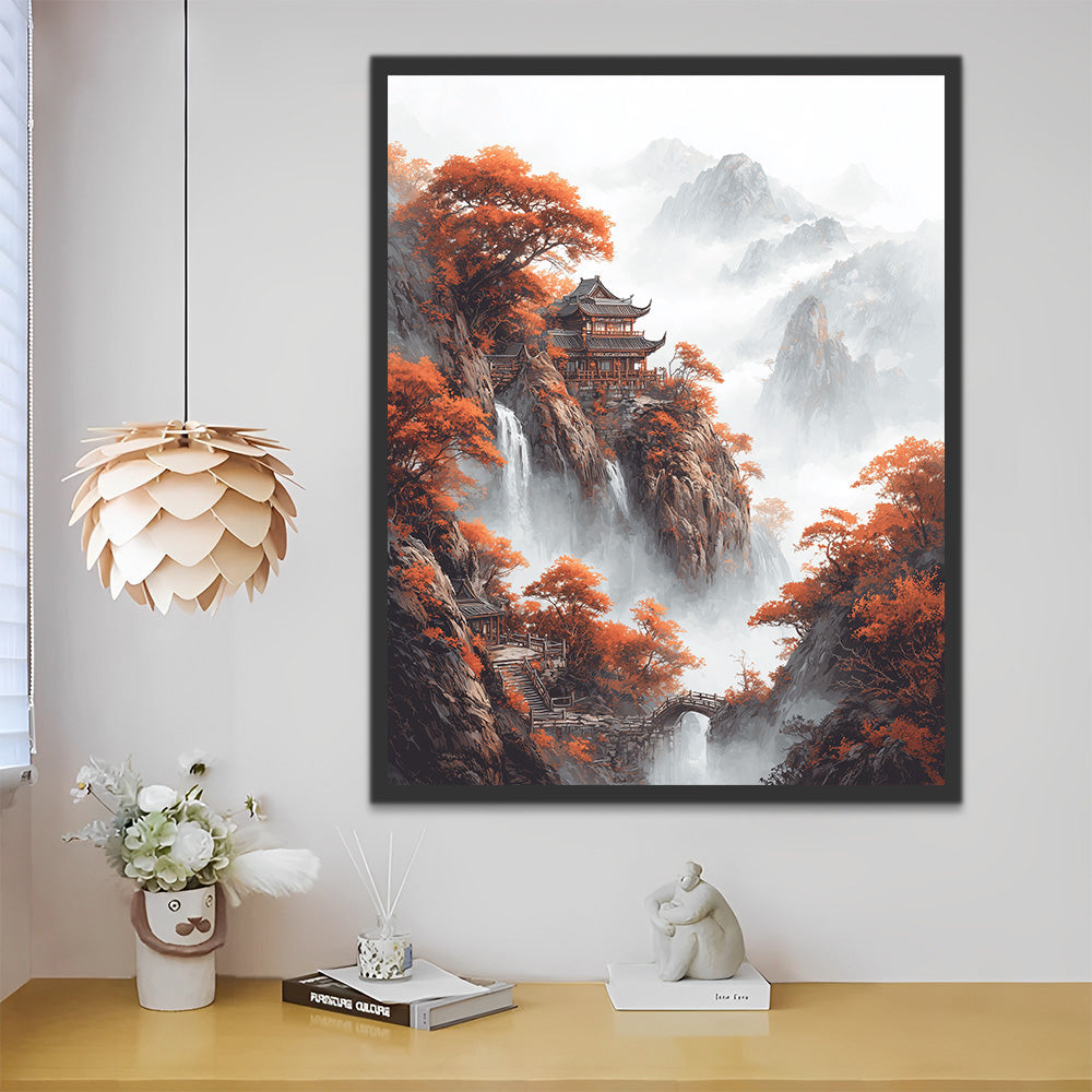 Tempeln und Ahornbäumen auf den in die Wolken ragenden Gipfeln Malen nach Zahlen