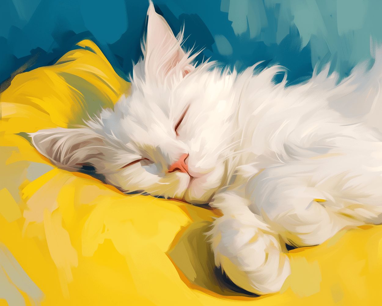 Weiße Katze schläft auf gelbem Kissen Malen nach Zahlen