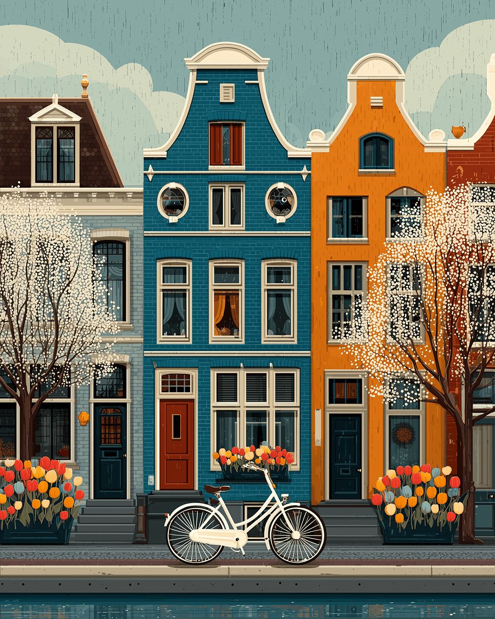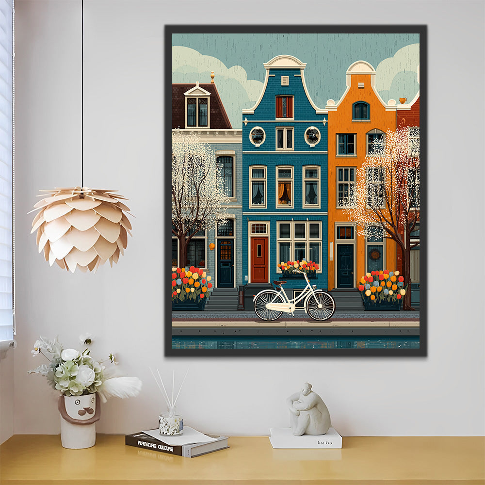 Weißer Baum und Fahrrad vor buntem Gebäude Malen nach Zahlen