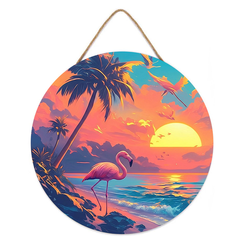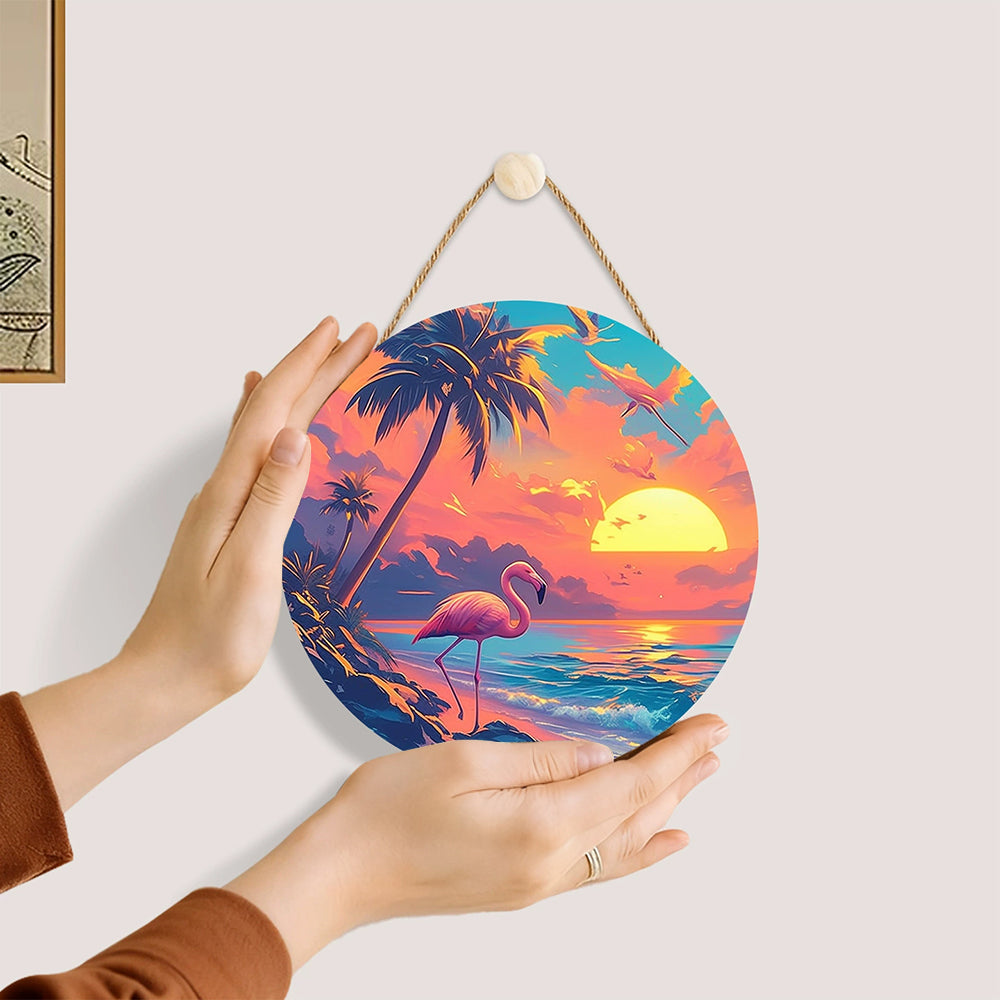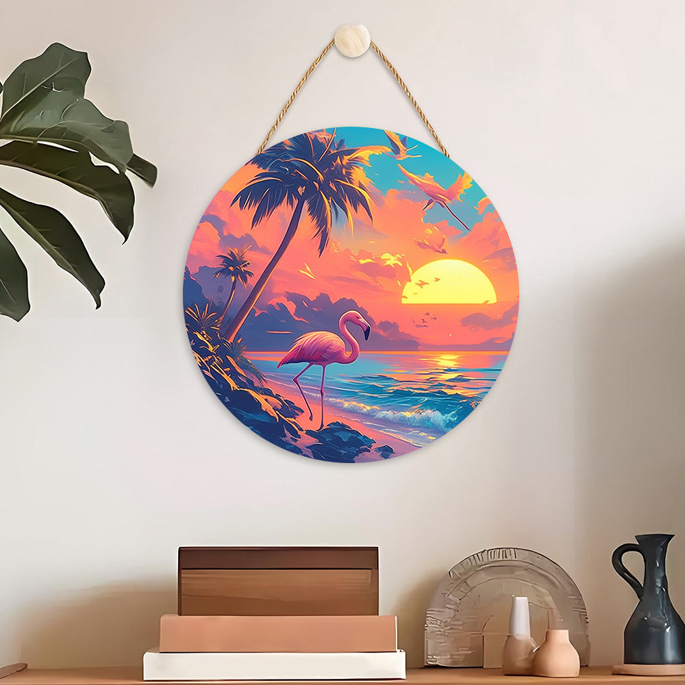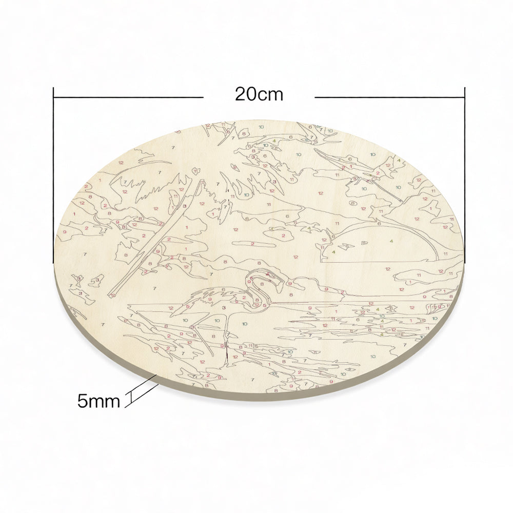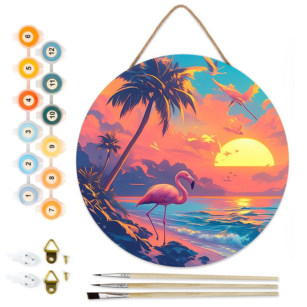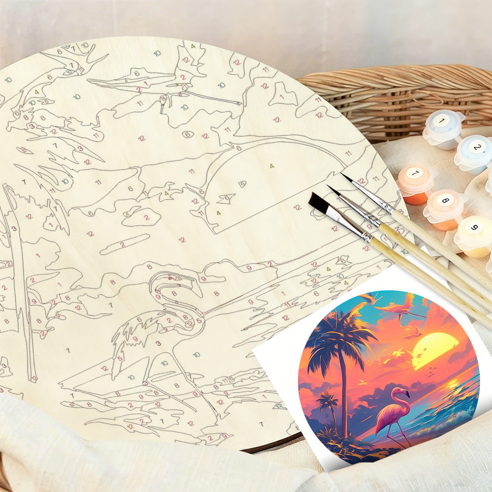 Malen nach Zahlen auf Holzscheibe - Das Meer und Flamingo bei Sonnenaufgang