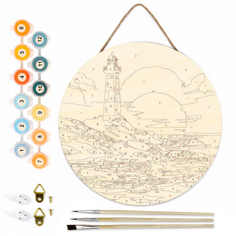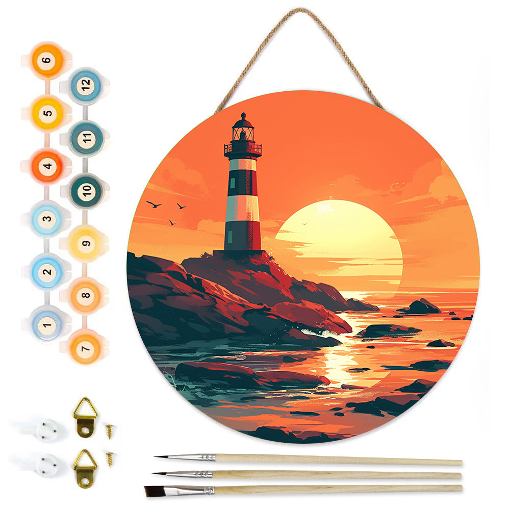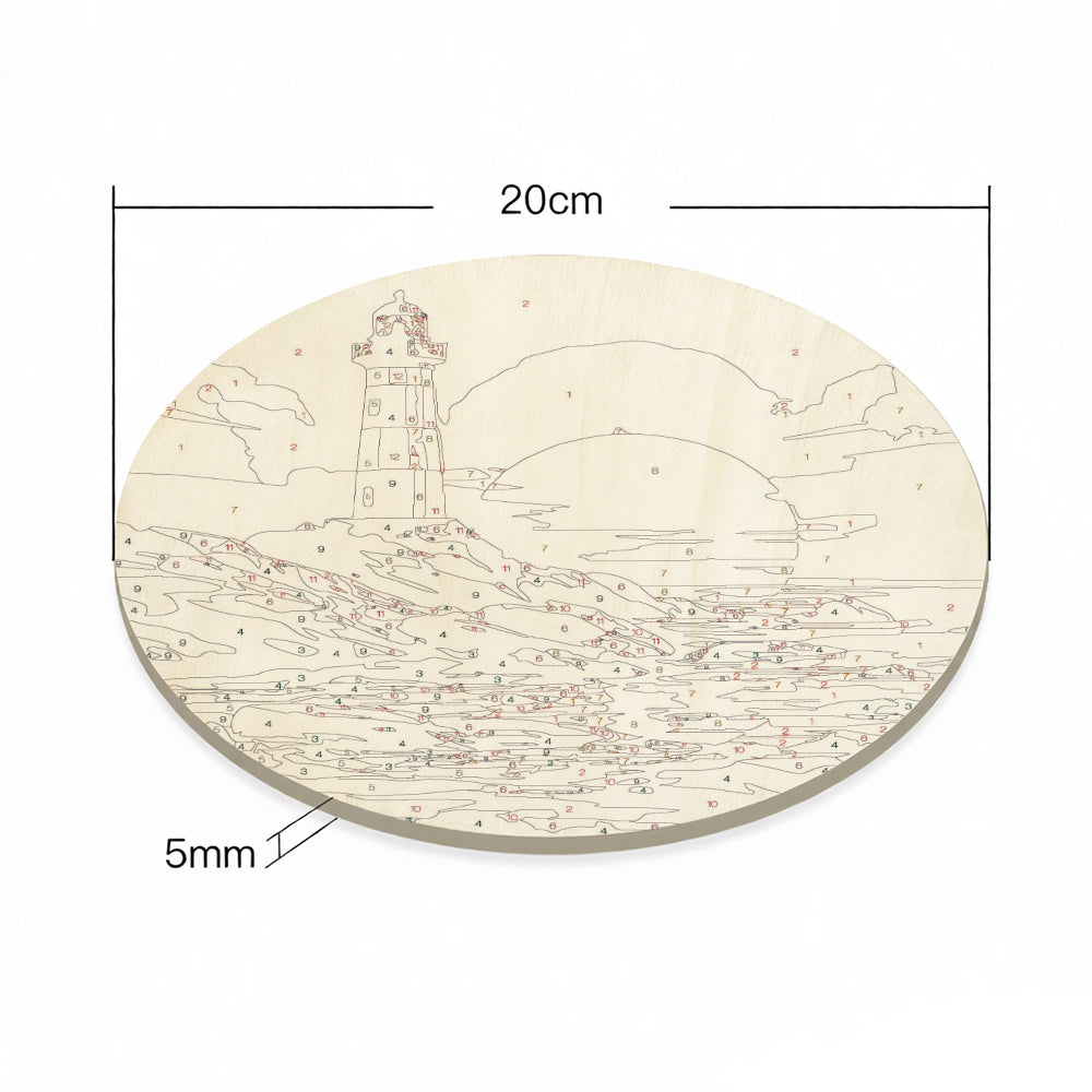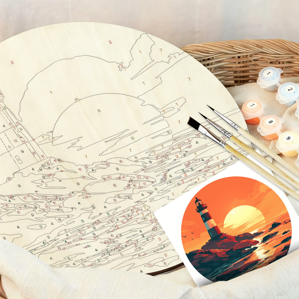 Malen nach Zahlen auf Holzscheibe - Ein Leuchtturm bei Sonnenuntergang