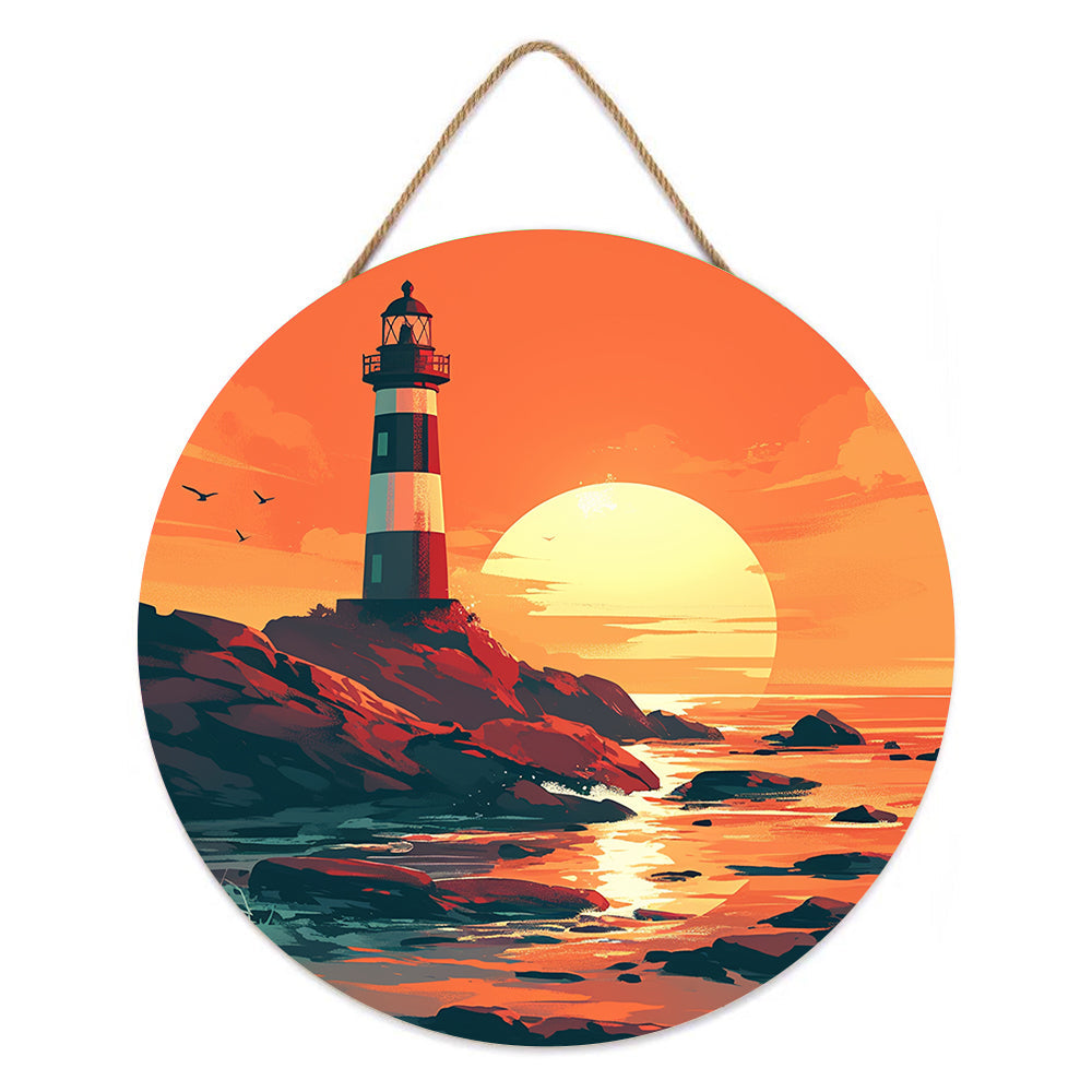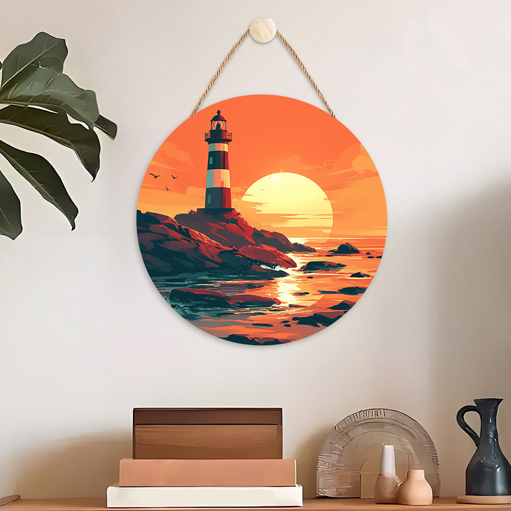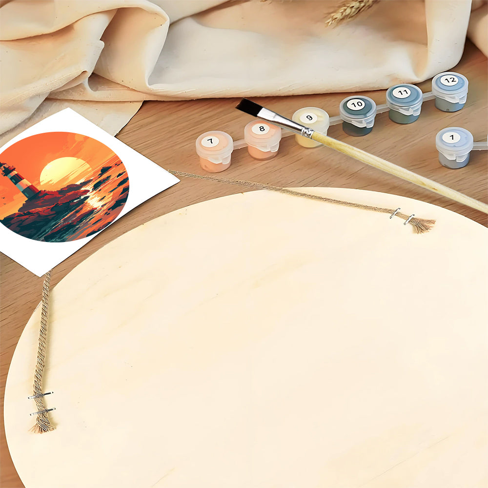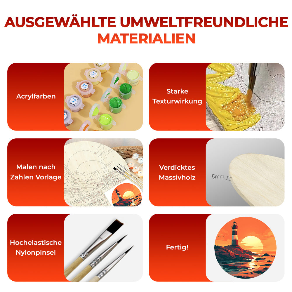 Malen nach Zahlen auf Holzscheibe - Ein Leuchtturm bei Sonnenuntergang