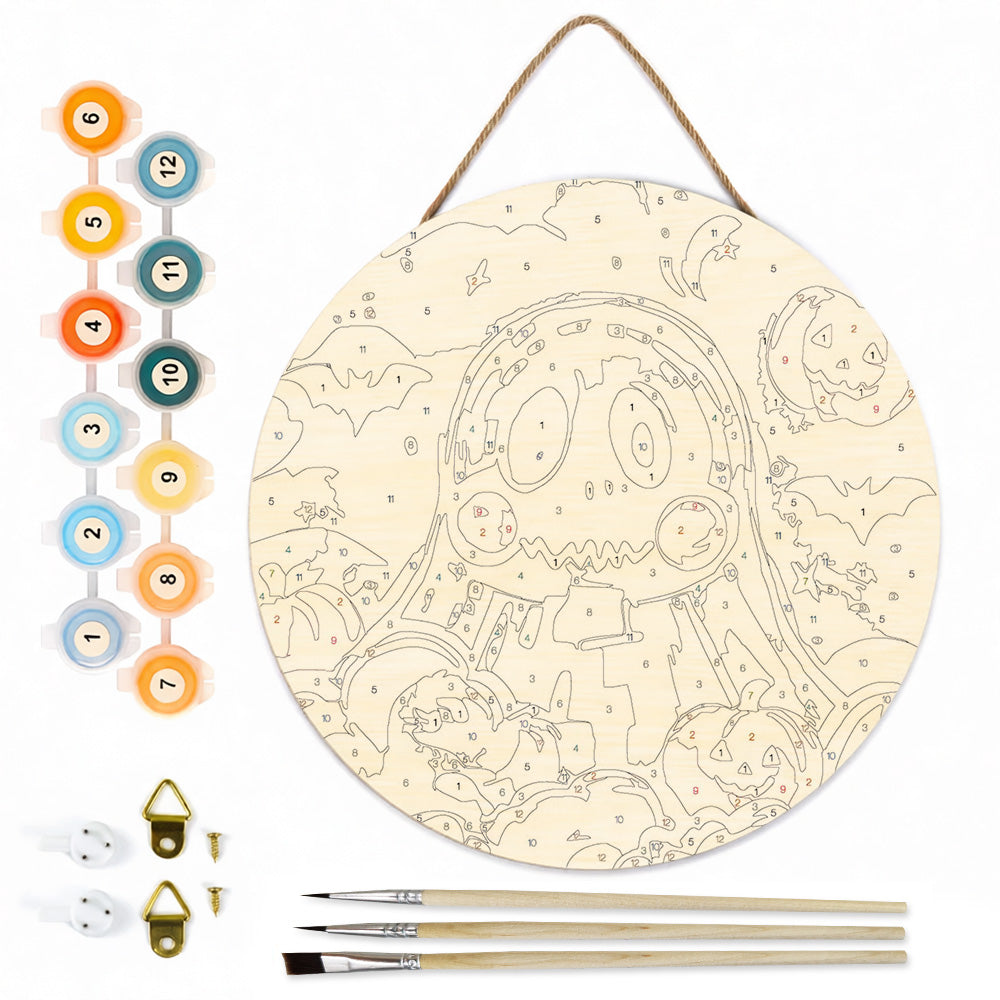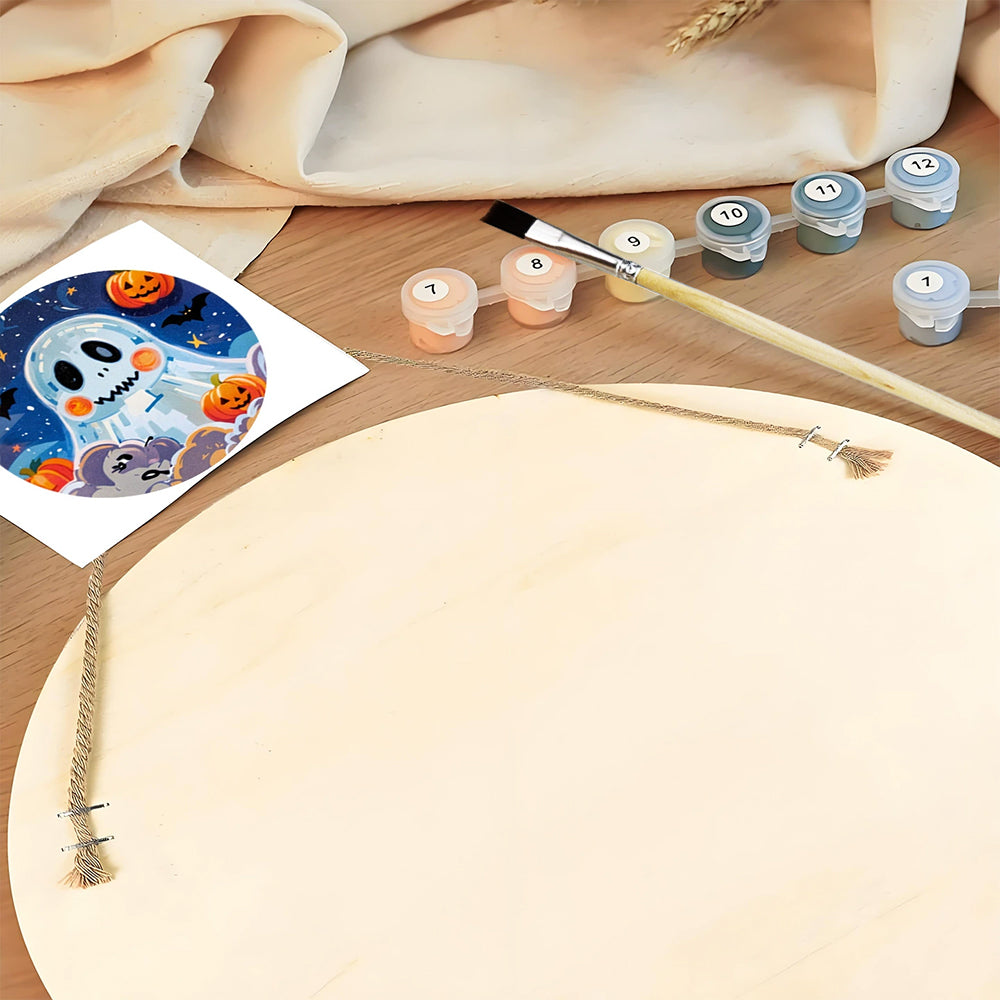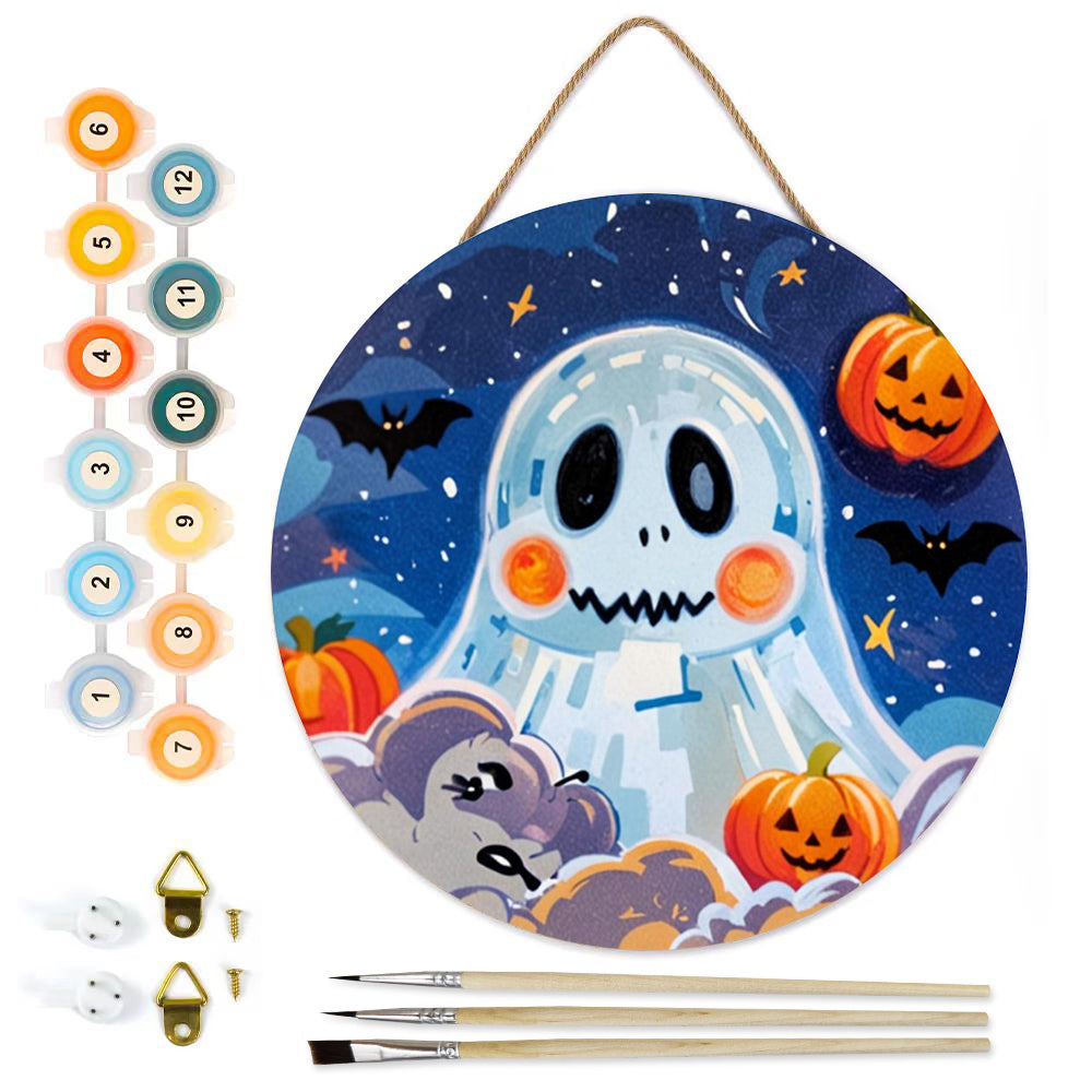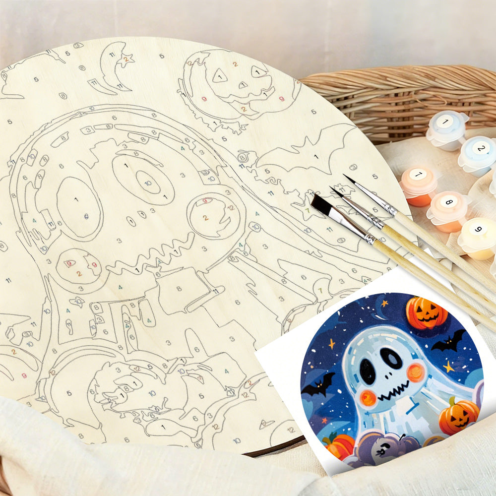 Malen nach Zahlen auf Holzscheibe - Süßer Halloween-Geist und Kürbis-Laternen