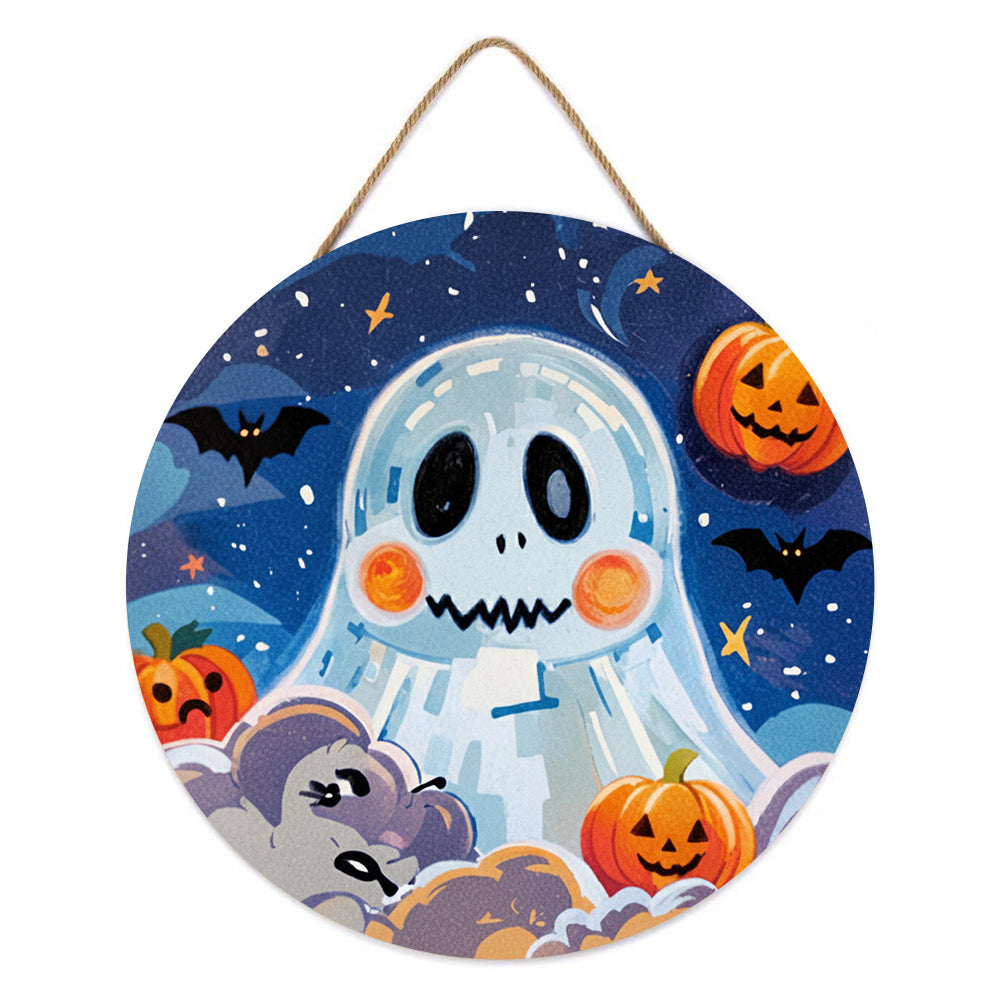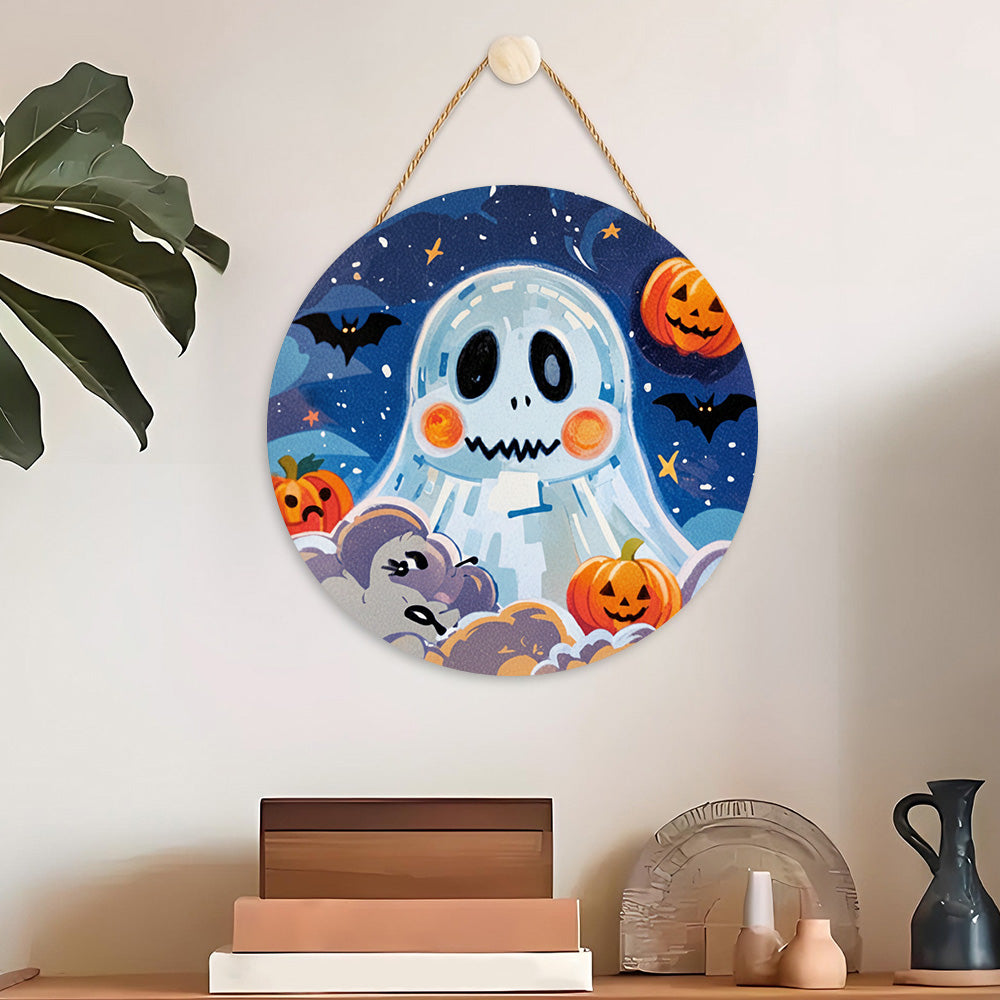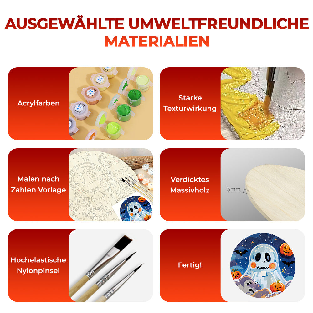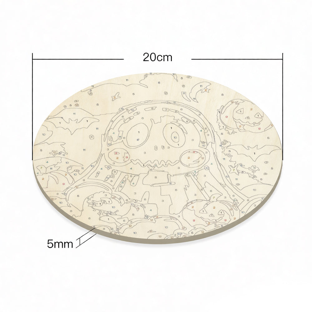 Malen nach Zahlen auf Holzscheibe - Süßer Halloween-Geist und Kürbis-Laternen