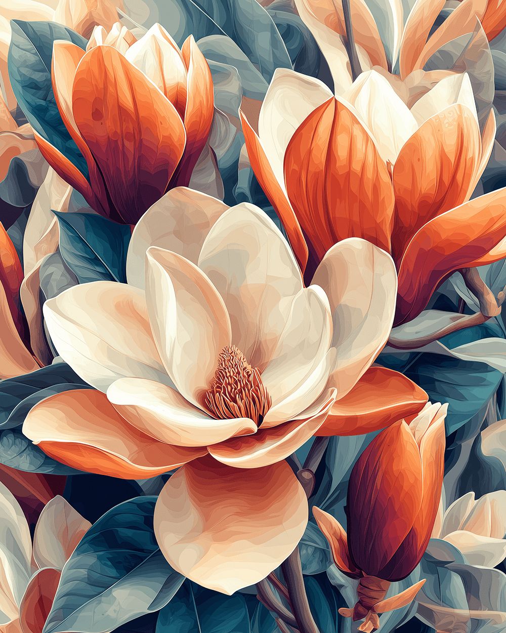 Weiße und orangefarbene Magnolienblüten Malen nach Zahlen