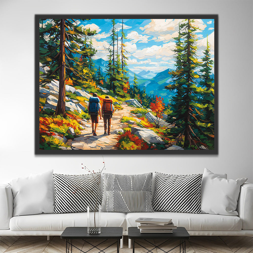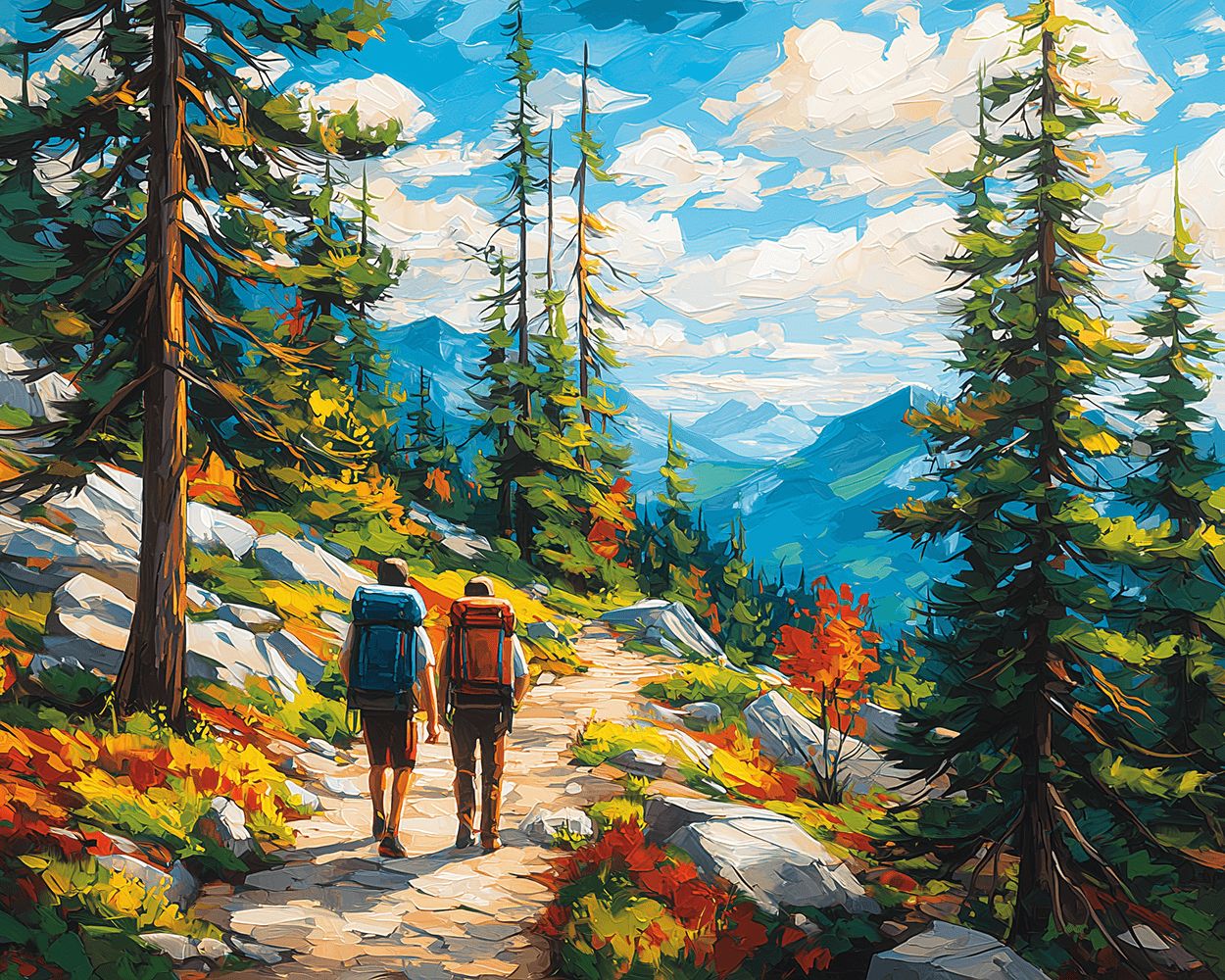 Zwei Rucksacktouristen in den Bergen Malen nach Zahlen