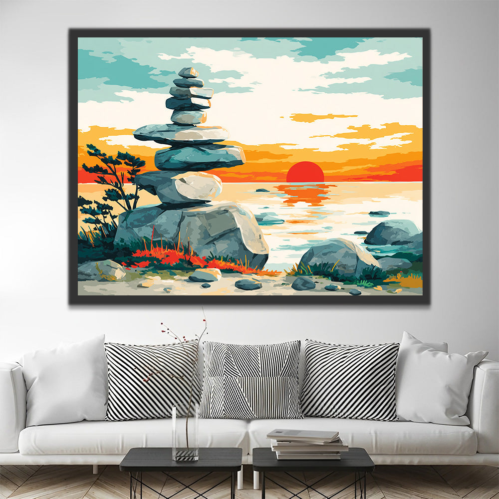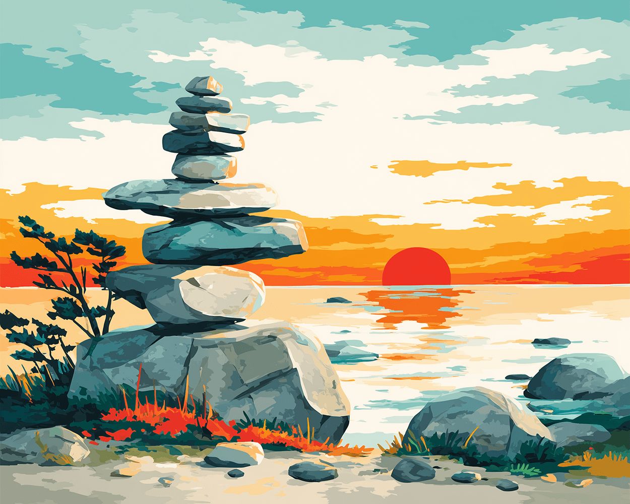 Gestapelte Steine bei Sonnenaufgang Malen nach Zahlen